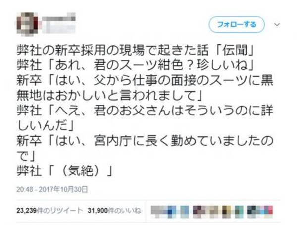 昨今 就活には黒無地スーツを着る学生が多い中 紺色のリクルートスーツで現れた新卒くん 父から仕事の面接に黒無地はおかしいと言われました その父の正体とは Togetter